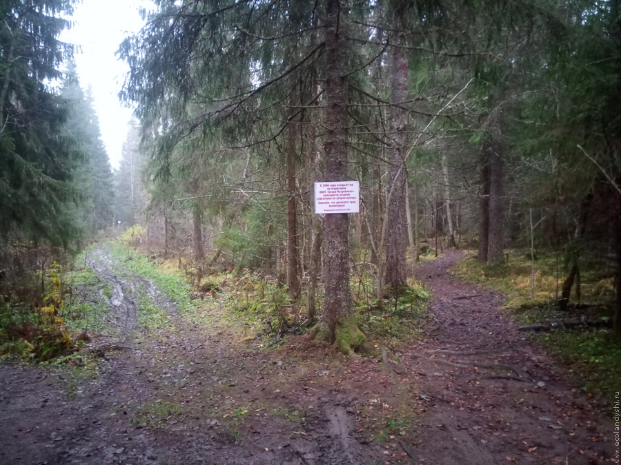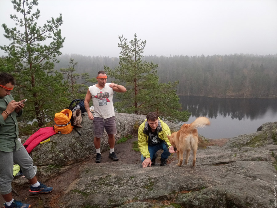 Итак, в означенный день около 9 утра я забрал вверенных мне волонтёров от метро «Девяткино» (большинство было из Москвы) и к 12 мы доехали до моста через речку Ильменйоки, от которого ведёт не очень проезжая и многократно перекрытая шлагбаумами дорожка к южной оконечности озера Ястребиное. Оставили машину, прошли километра полтора и остановились на стоянке федерации альпинизма (а на Больших скалах разные альпклубы и спортсекции из разных ВУЗов курируют «свои» стоянки, следя за инфраструктурой и поддерживая на них порядок). Погода пасмурная, время от времени шёл мелкий-премелкий дождик. Дождались остальных участников, повесили тент, поставили палатки, попили чаю, получили вводные от координатора и отправились по вверенным локациям.