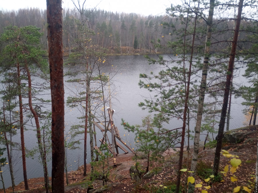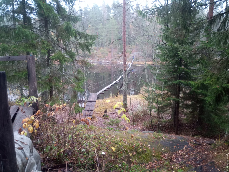 | На вершине скалы Парнас | Подвесной мост через озеро Клюквенное (Хухтилампи) | Табличка про осенние субботники |