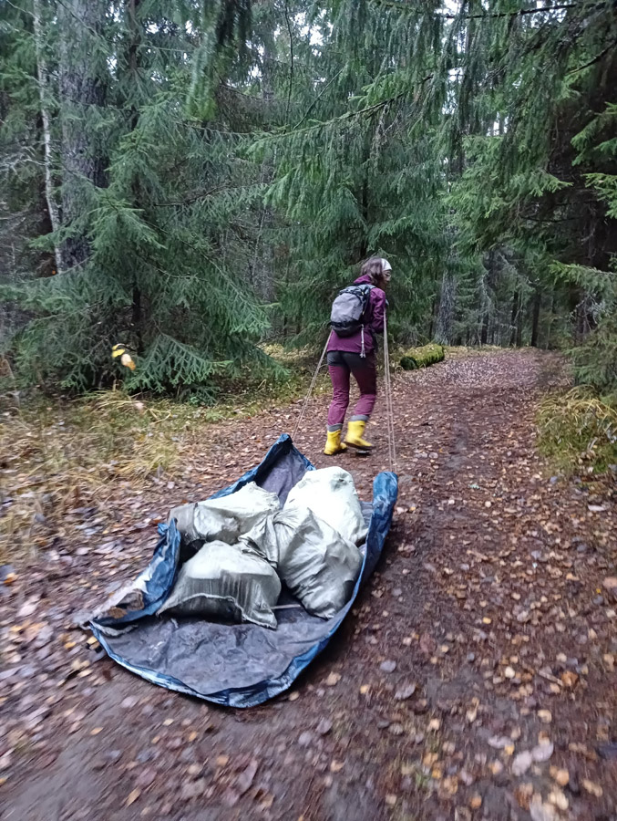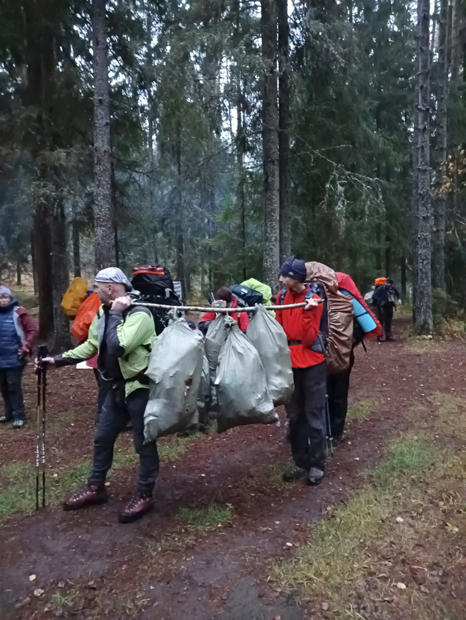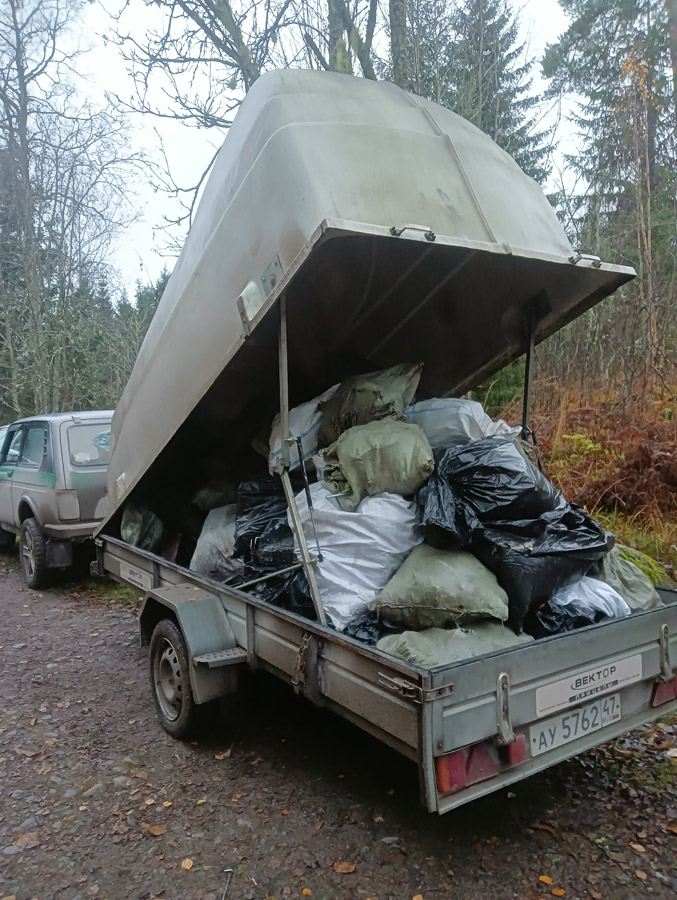 Утром продолжили сбор нового мусора и перетаскивание вчерашнего к месту, откуда его можно вывезти (к вышеупомянутому мосту через Ильменйоки, точнее за него). Я отправился к широко известной тарзанке на Ястребином и начал таскать оттуда мешки с мусором, сначала к нашему лагерю (примерно полтора километра), а потом к мосту (ещё столько же), откуда его должны были вывезти лесничие, вернее сотрудникии ООПТ. Собрать мусор это лишь полдела, ведь вытащить его к автодоступному месту — не менее трудоёмко.