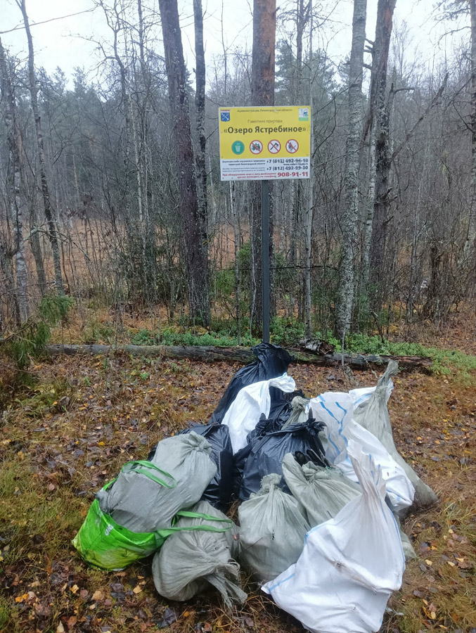 | Информационный щит про экологический маршрут по окрестностям озера Ястребиное | Тарзанка на озере Ястребиное | Мусор, собранный волонтёрами около тарзанки |